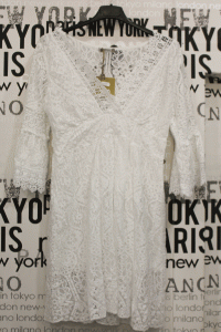 Vestido corto, de escote en pico. Manga tres cuartos, con volante pequeño